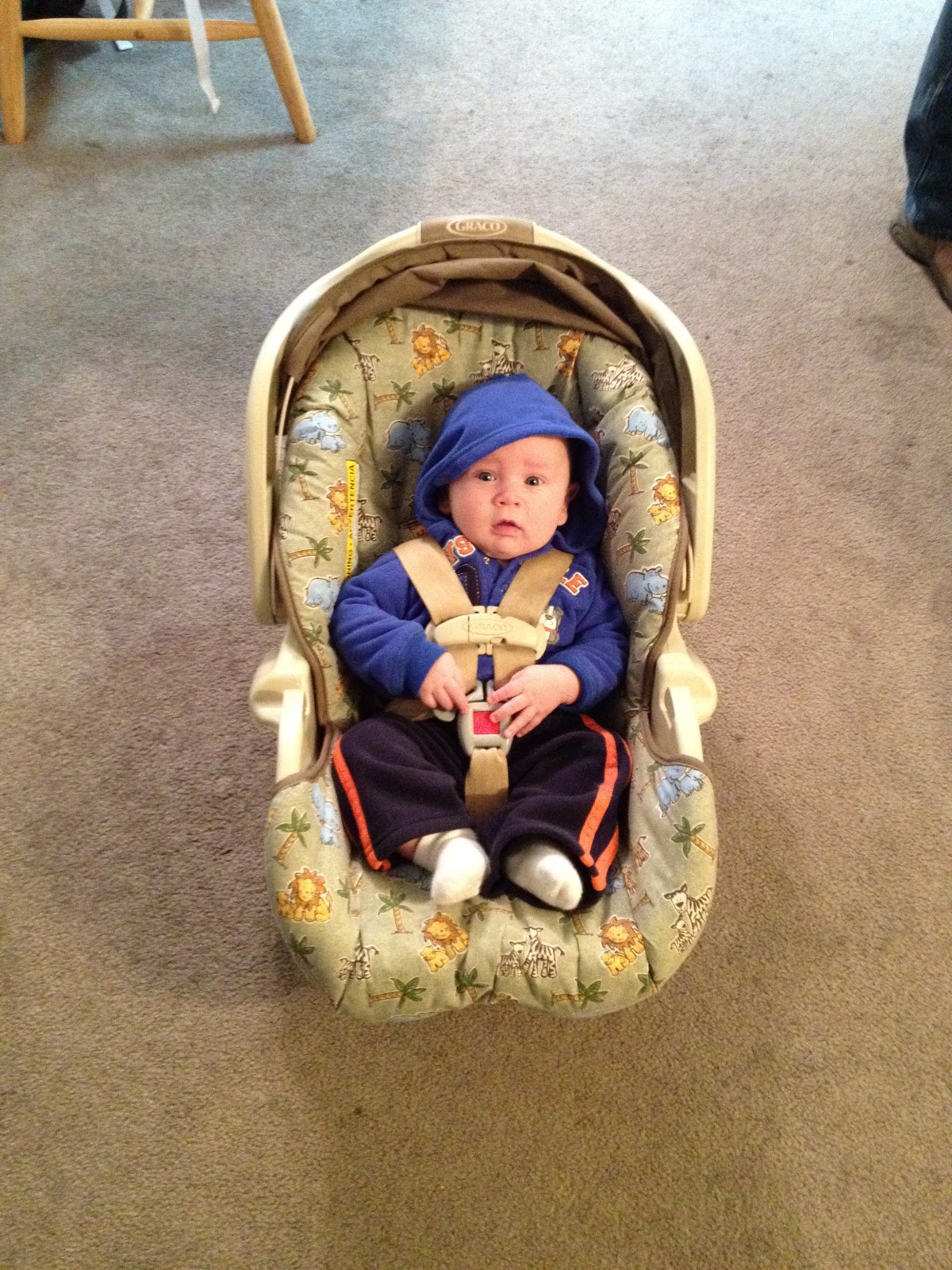 On Saturday, David officially hit the 3 month mark, which is a pretty big milestone for all of us. He’s still doing well, and growing like crazy. Our last estimate (from our bathroom scale) is that he weighs 15 pounds! No wonder he feels heavy to carry around. We celebrated his birthday by going to a birthday party for a friend who turned one this week! David loved watching the other babies crawl and walk around. This was the first time he’s really shown interest in other “little people.”