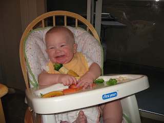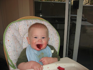 David has begun eating solid foods in earnest. We’re trying baby-lead weaning, which can be summarized as “let David put whatever he wants into his mouth.” Needless to say, David has readily adopted this philosophy.