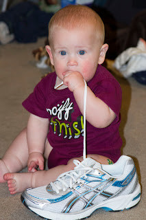 He’s also grown quite a bit in the past month. Unofficially, we’ve weight David at 21.5 lbs! Here’s our little Buddha showing off his well-marbled physique: